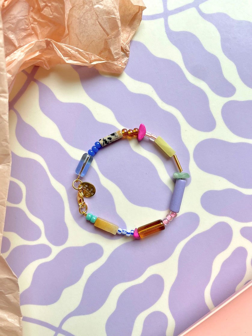 Handgemachtes, feines Armband aus einer schönen Mischung an verschiedenen Perlen (Glas, Keramik, Stein, goldenem Messing - nickelfrei).