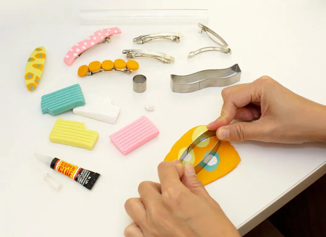 Enthält 6 Clips, 5 Farben Polymer Clay, 1 Tube Superkleber, 3 Tonausstecher in einzigartigen Formen und einen Pinienholzroller