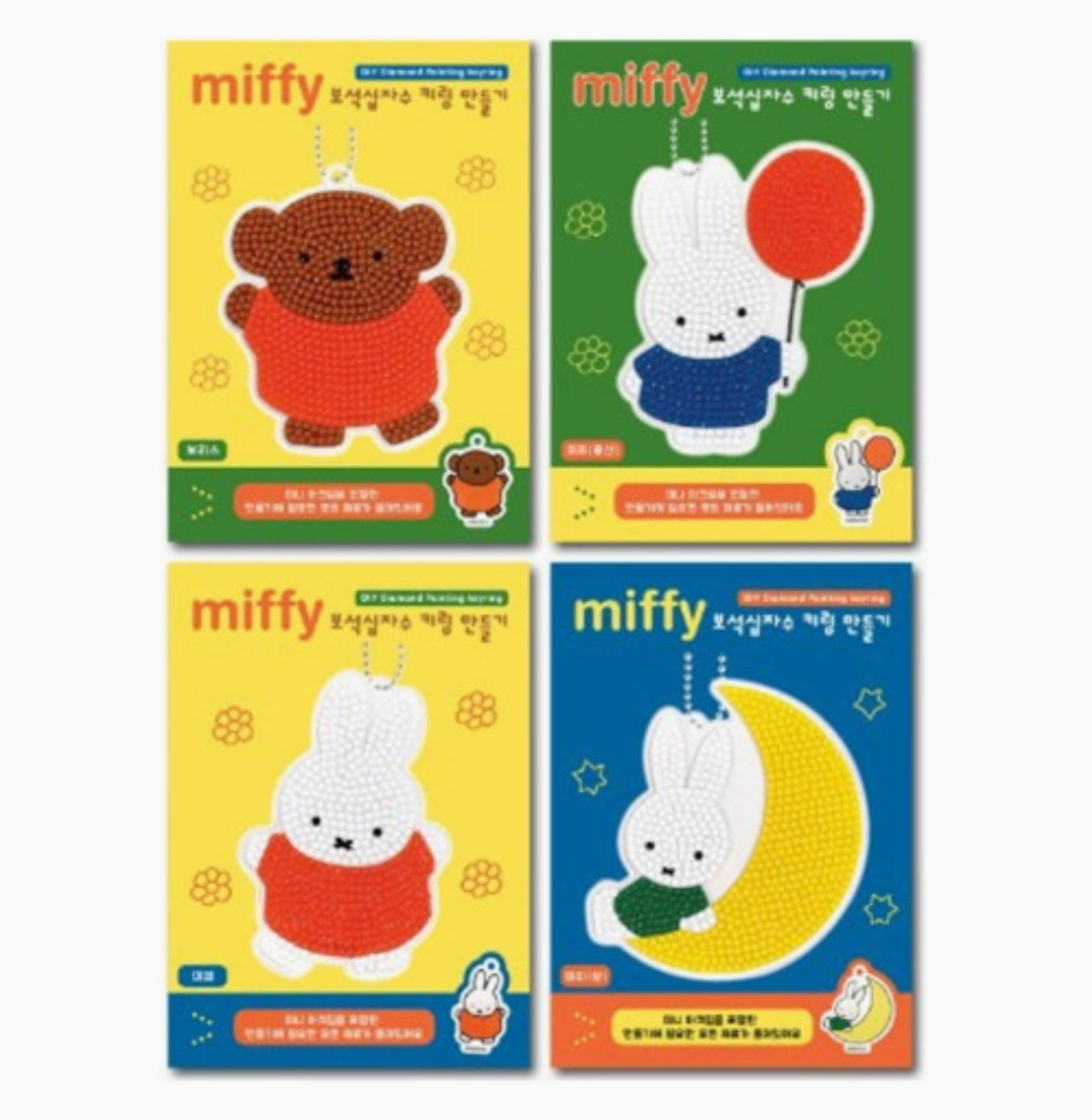 Erstelle Deine eigenen niedlichen Miffy-Schlüsselanhänger mit diesem Diamantmalerei-Kit. Das Set enthält alles, um einen funkelnden Schlüsselanhänger mit verschiedenen Miffy-Motiven zu gestalten, z. B. Miffy auf einer Mondsichel sitzend, mit Ballon oder im klassischen roten Kleid.