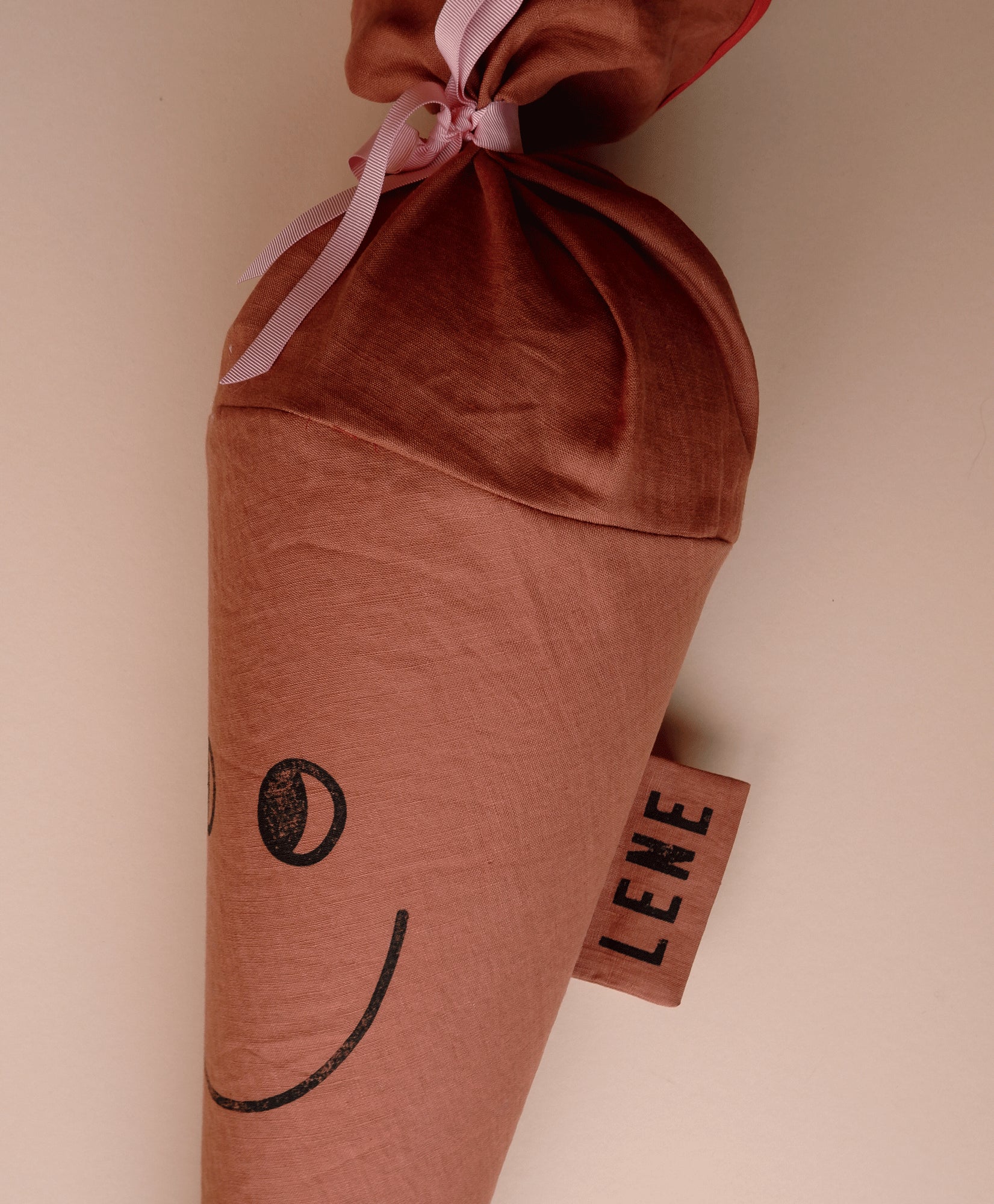 Das süße Gesicht wird von Hand auf den Stoff gestempelt und verleiht der Schultüte ihren charakteristischen, positiven Ausdruck.