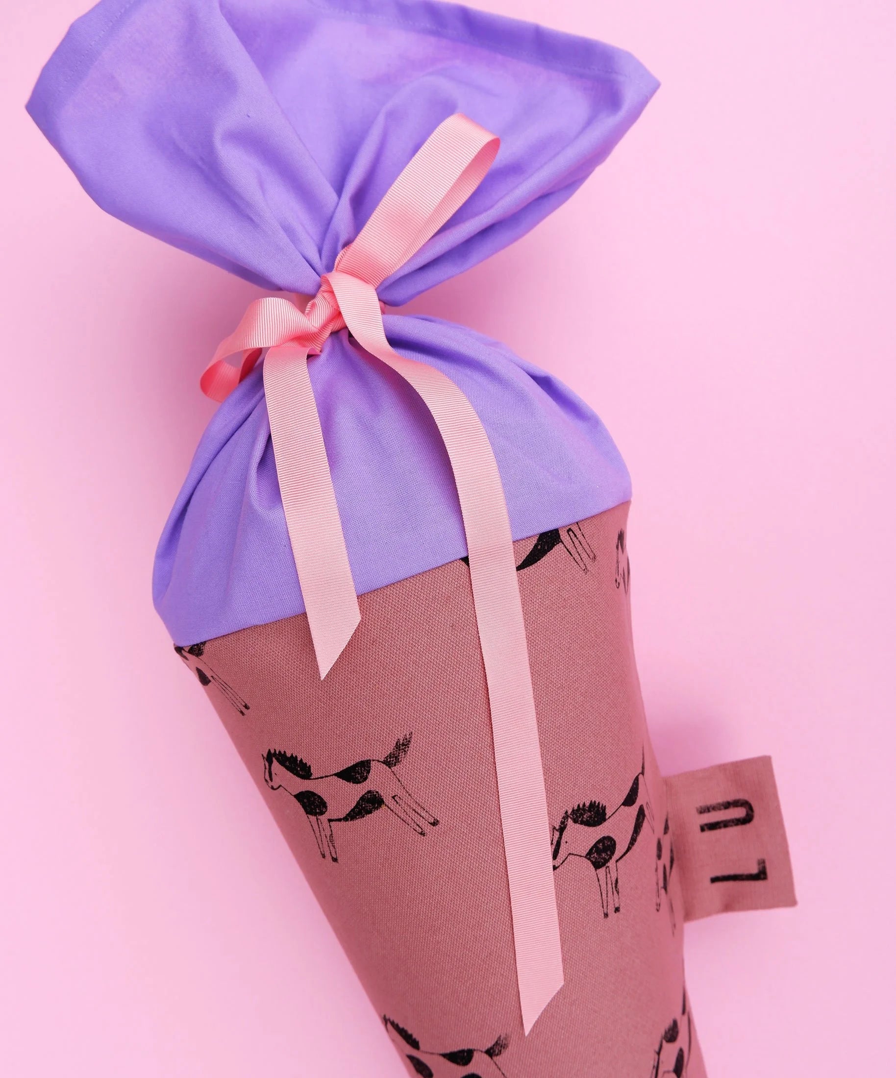 Diese Schultüte aus Stoff mit Pferde-Motiv in Mauve ist ein fröhlicher Begleiter zur Einschulung und zaubert schon beim ersten Anblick ein Lächeln ins Gesicht.