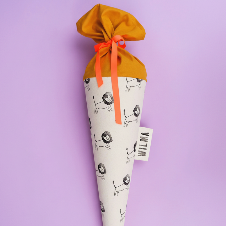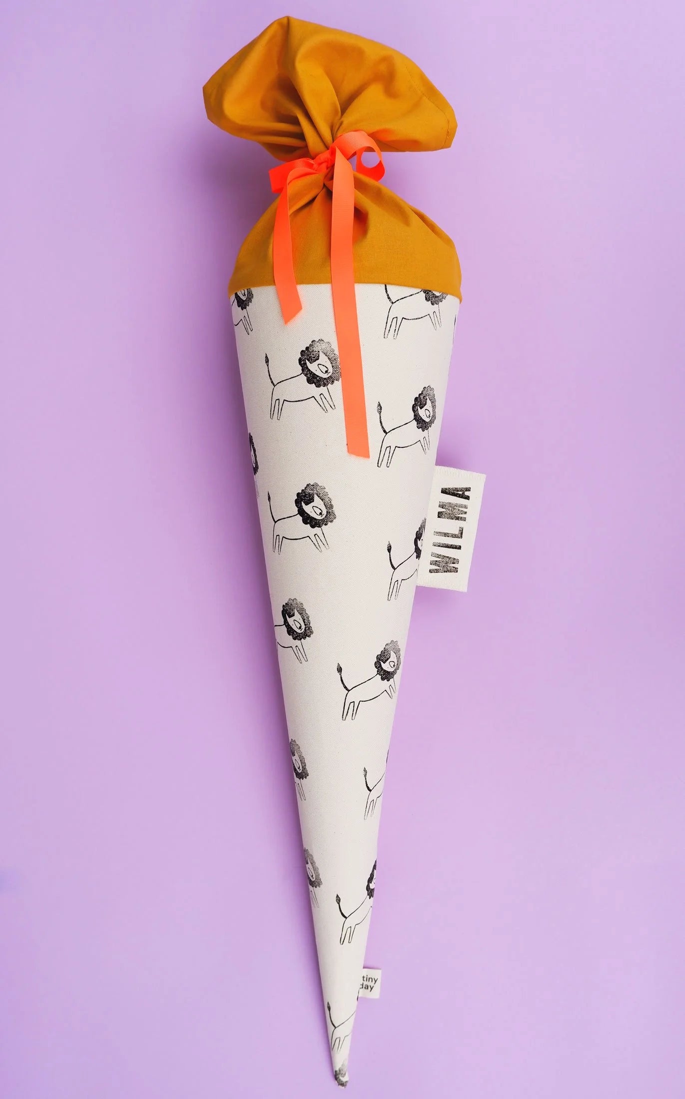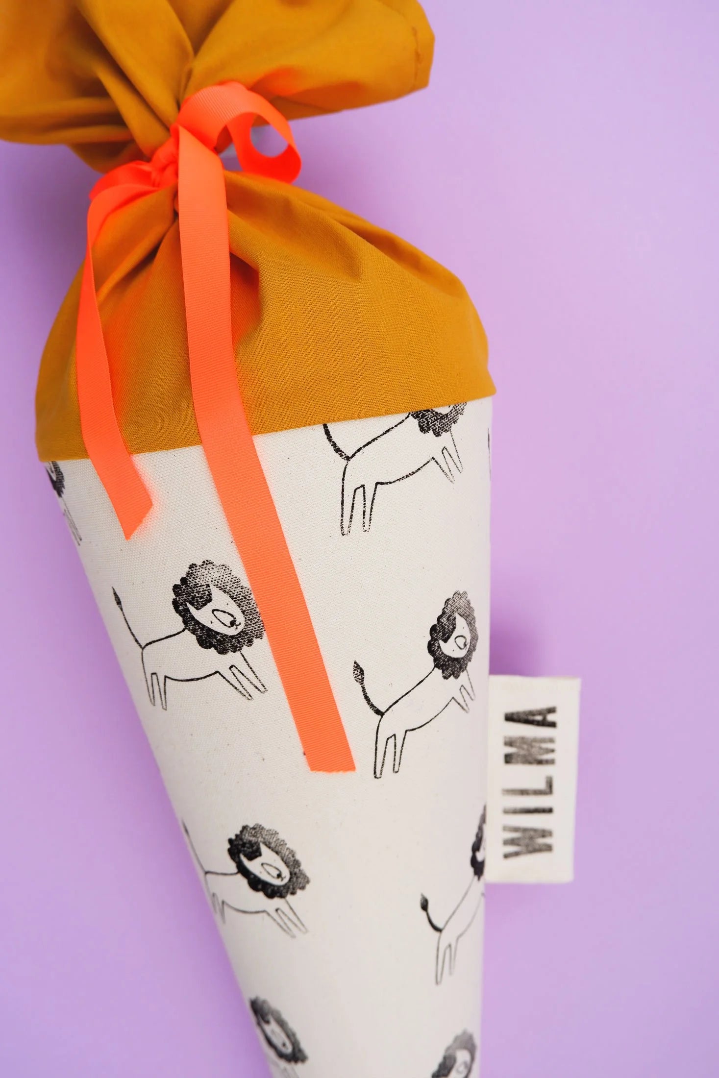 Individuelle Schultüte aus hochwertigem, stabilem Bio-Baumwollstoff. Von Hand mit klaren, frischen Motiven bestempelt. Auf Wunsch kann die Schultüte mit einem Namen auf einem großen Stoff-Label an der Seite versehen werden. Das Stempelmotiv, die Farbe der Stoff-Krempe und die Farbe des Bandes zum Zuknoten können frei kombiniert werden.