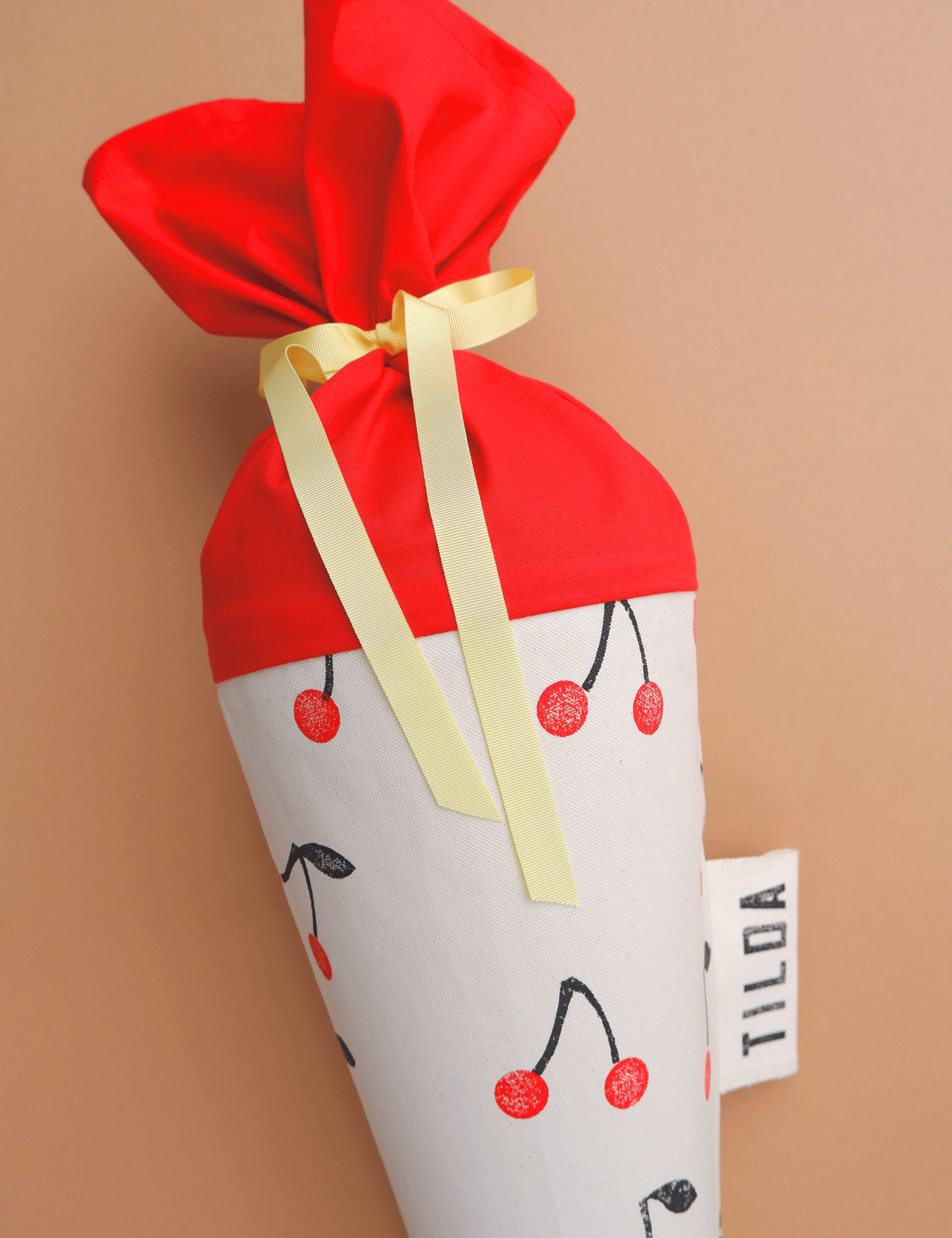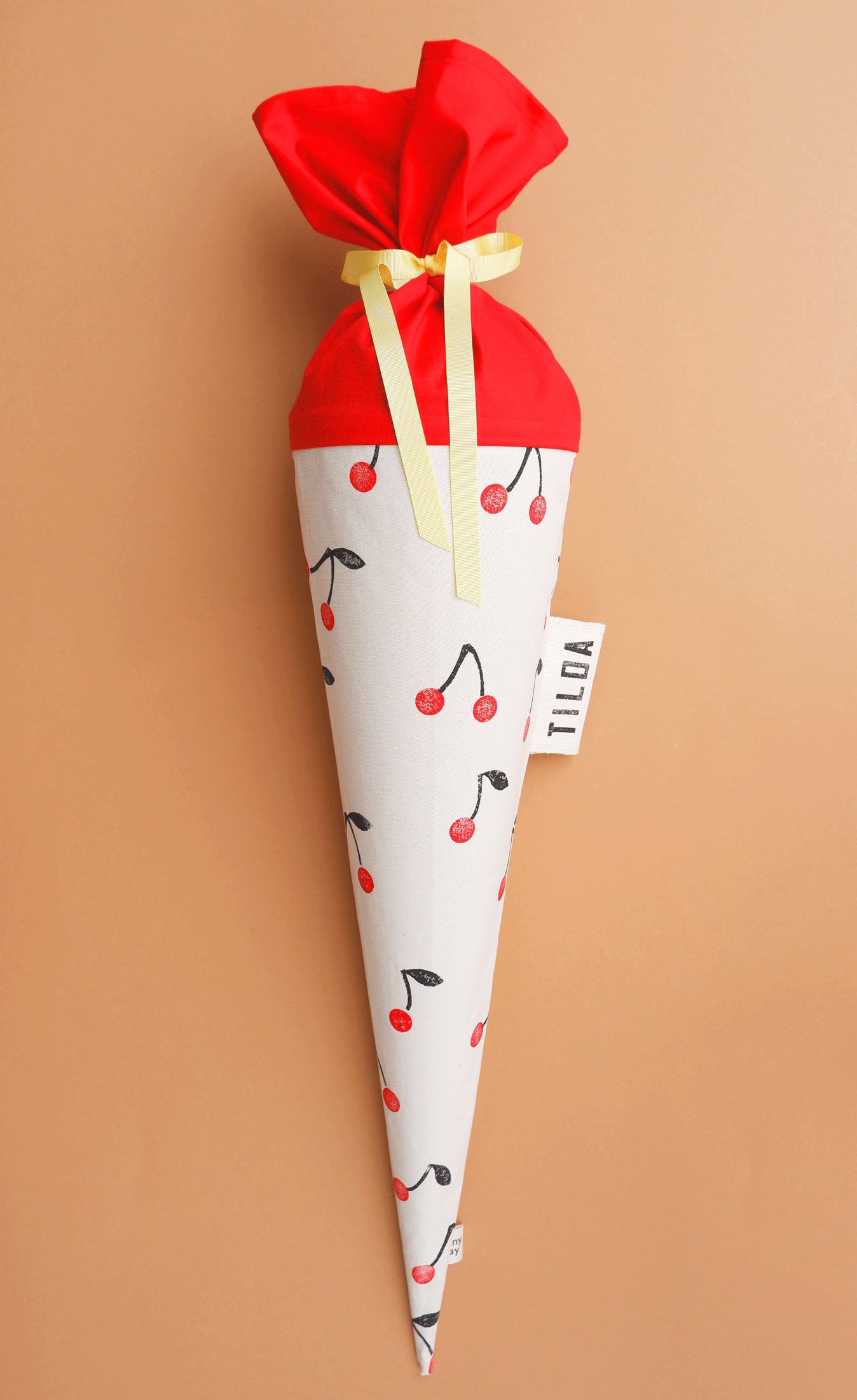 Die Kirschen werden in leuchtendem Rot auf den Stoff gestempelt und verleihen der Schultüte einen klaren, verspielten Charakter.