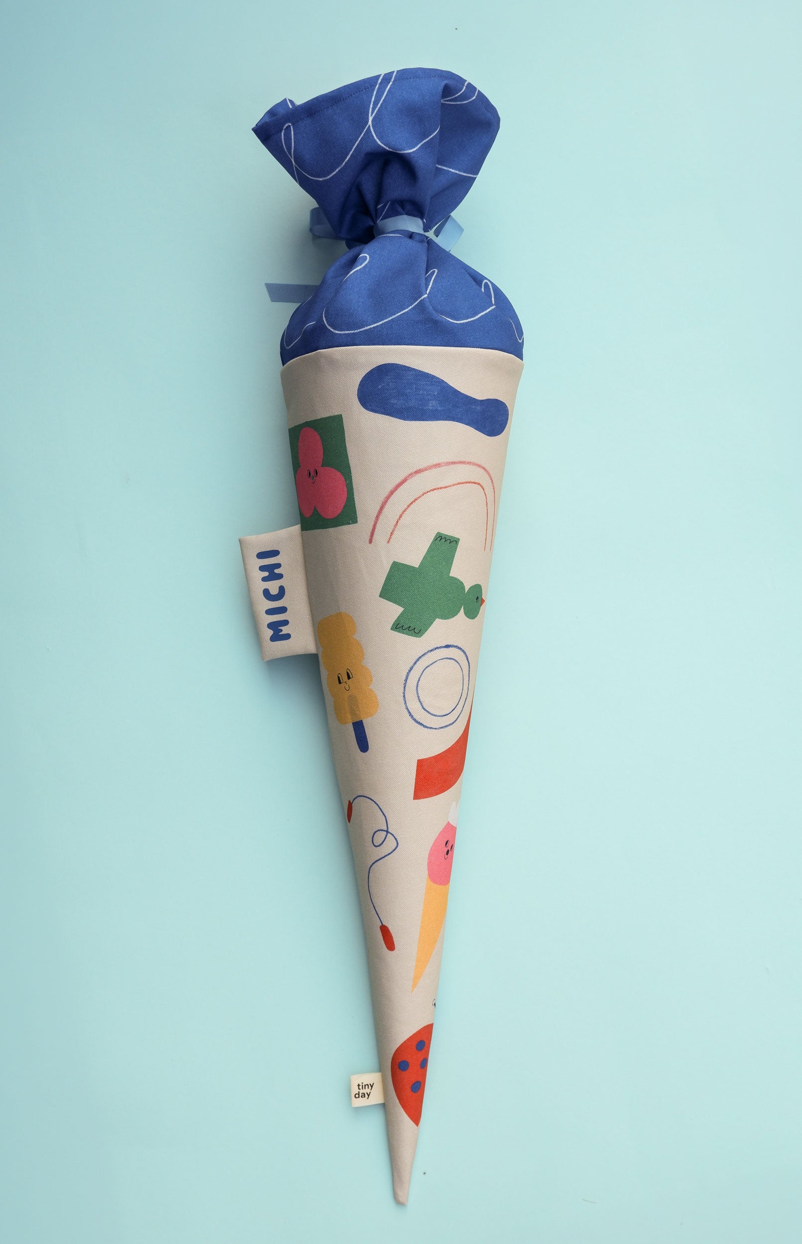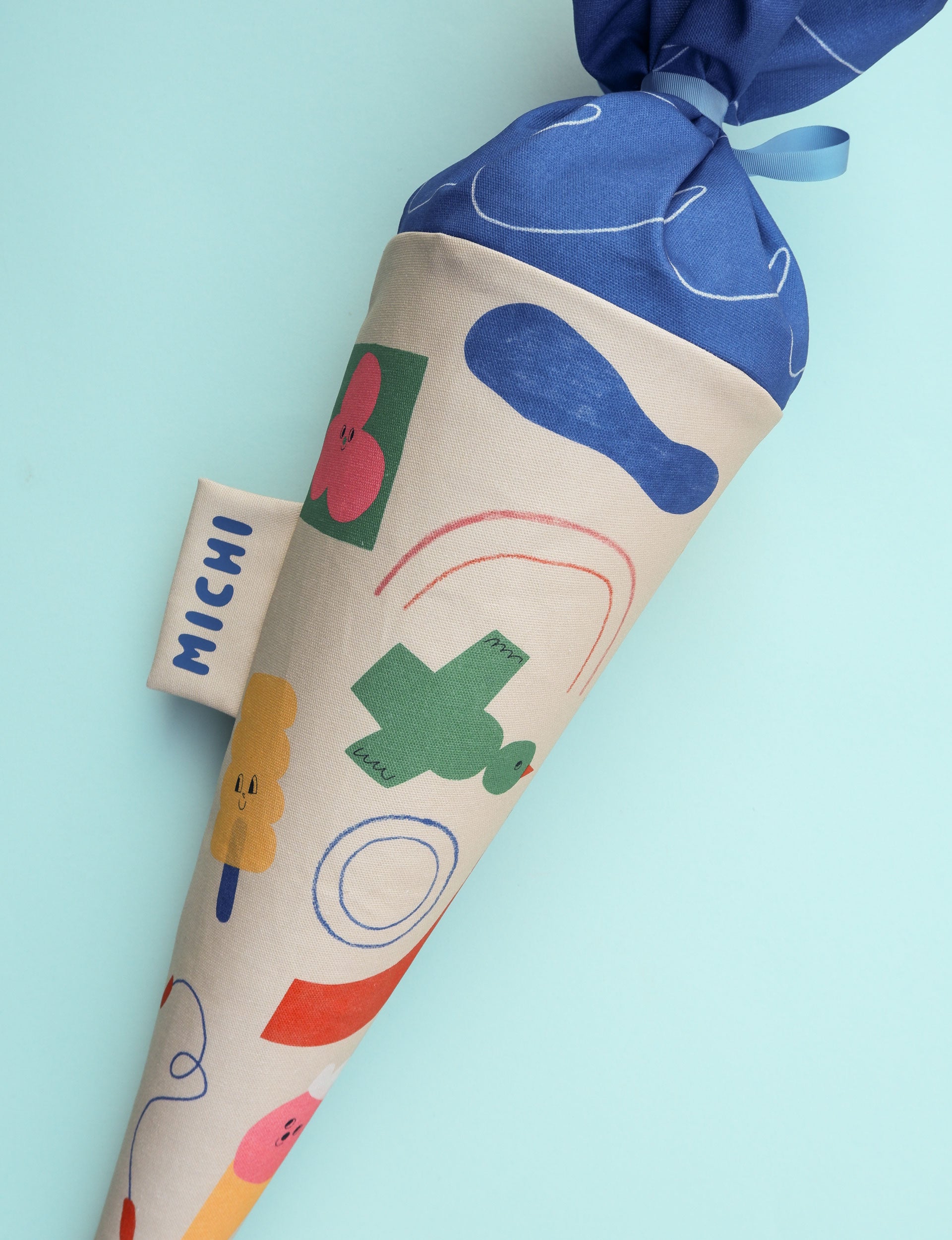 Die Schultüte wird mit Liebe von Hand individuell hergestellt und besteht aus hochwertigem, stabilem Baumwollstoff.